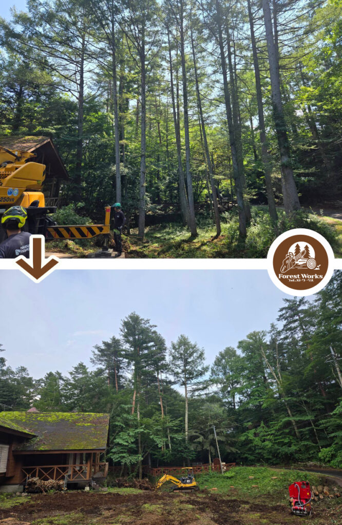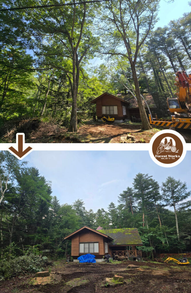 山梨県鳴沢村の京王別荘地にてK様邸土地のクレーン伐採をさせていただきました。安全確保し無事終了できました。